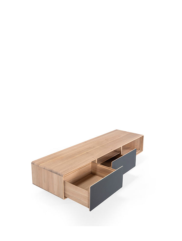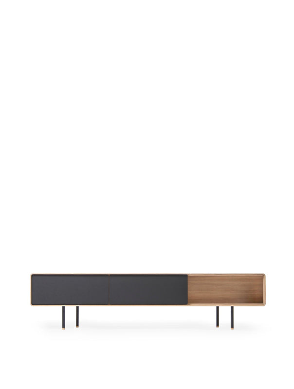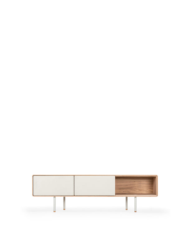 The Fina Lowboard presents a composed and understated approach to storage, defined by slim proportions and a careful layering of materials. Solid oak construction brings warmth and authenticity, while linoleum fronts introduce a soft, matte surface that contrasts elegantly with the precision of powder‑coated steel legs. Designed for flexibility, the lowboard accommodates doors, shelves and drawers, making it equally suited to residential, workplace and hospitality interiors. Finished with plant‑based hardwax oils that preserve the natural character of the timber, Fina offers functional storage with a quiet, architectural confidence and a timeless modern appeal.