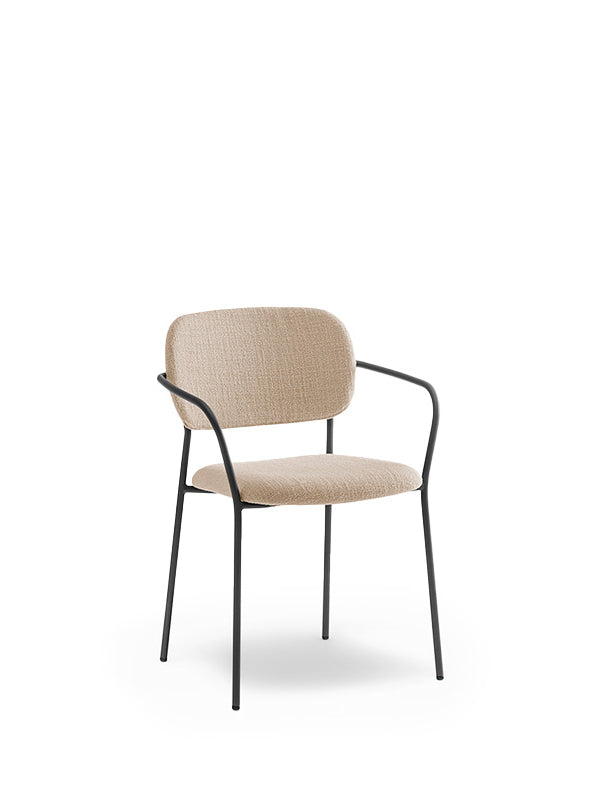 The Jazz 3704 Chair with armrests blends ergonomic comfort, sleek design, and timeless elegance. Featuring a padded seat and backrest with a functional opening, it's supported by a light, durable steel frame. Customise your chair with a choice of fabric or imitation leather upholstery, paired with a variety of steel finish options, to perfectly complement your space.