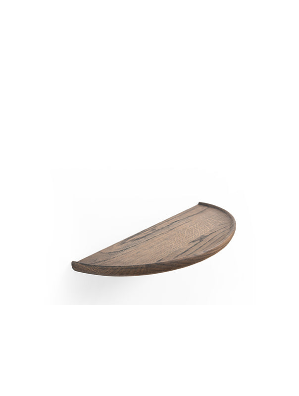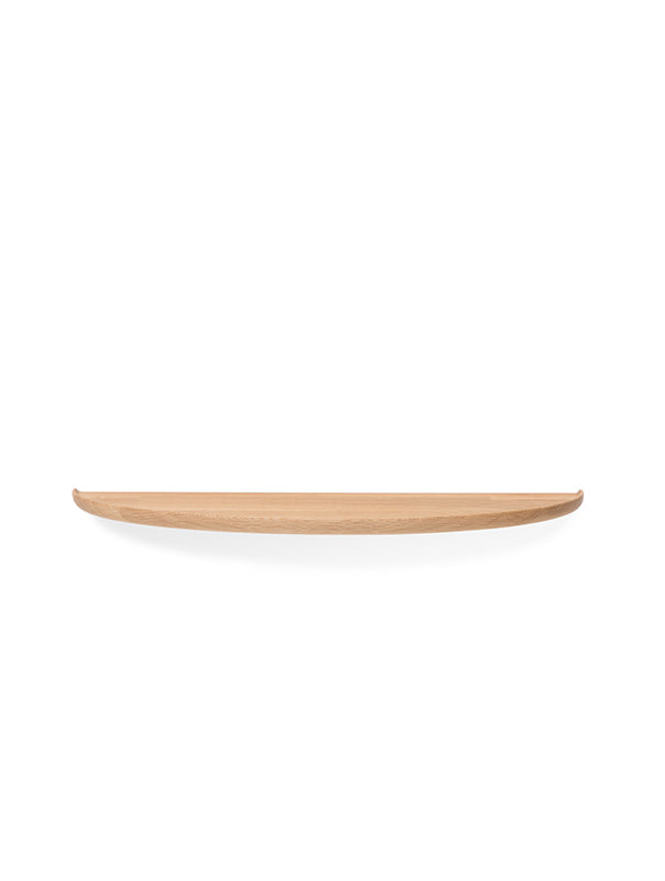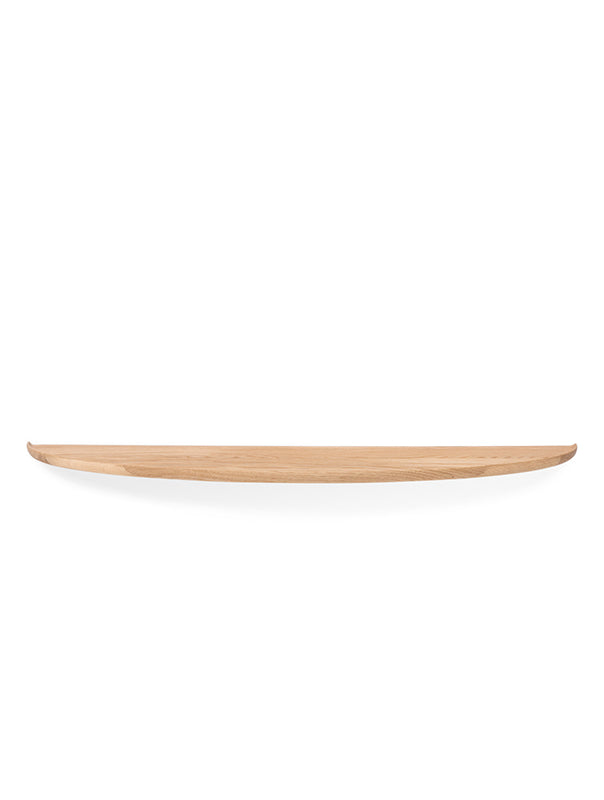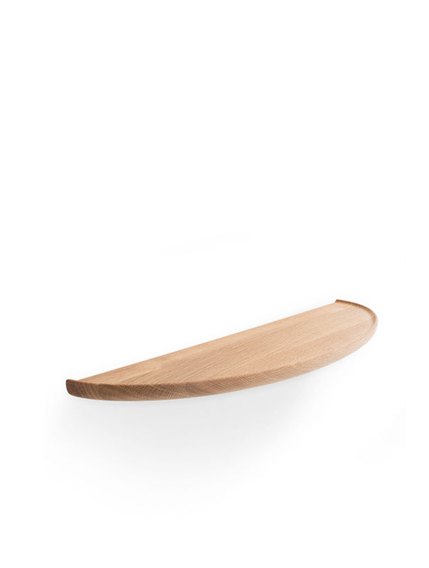 The Mu Floating Shelf is an elegantly minimal storage solution crafted from solid wood to bring warmth and character to both contemporary and traditional interiors. Its distinctive semi‑elliptical form creates a soft, organic silhouette that appears to float effortlessly on the wall, enhancing spatial clarity while casting subtle, expressive shadows. A routed plate with gently raised, rounded edges provides a refined visual detail while keeping objects securely in place. Smoothly sanded and finished with natural oils, Mu offers a silky tactile feel. Available in three sizes and two finishes, the Mu Floating Shelf supports flexible, custom wall compositions, whether used individually or arranged as a coordinated set of three.